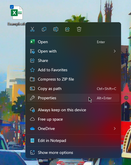 - Find your file you wish to allow macros on and right click. Choose Properties from the menu.